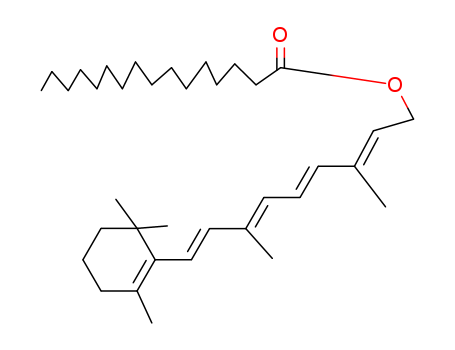The chemical formula of Retinol palmitate is C36H60O2 which containing 36 Carbon atoms,60 Hydrogen atoms and 2 Oxygen atoms,and the molecular weight of Retinol palmitate is 524.871.