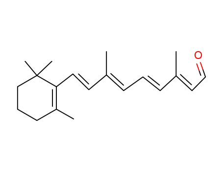 Retinal,all-trans- (8CI);Retinene 1 (6CI);(all-E)-3,7-Dimethyl-9-(2,6,6-trimethyl-1-cyclohexen-1-yl)-2,4,6,8-nonatetraenal;2,4,6,8-Nonatetraenal, 3,7-dimethyl-9-(2,6,6-trimethyl-1-cyclohexen-1-yl)-,(all-E)-;Axerophthal;E-Retinal;Retinaldehyde;Retinene;Vitamin A aldehyde;Vitamin A1 aldehyde;all-E-Retinal;all-trans-Retinal;all-trans-Retinaldehyde;all-trans-Vitamin A aldehyde;trans-Retinal;trans-Vitamin A aldehyde; |